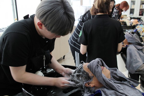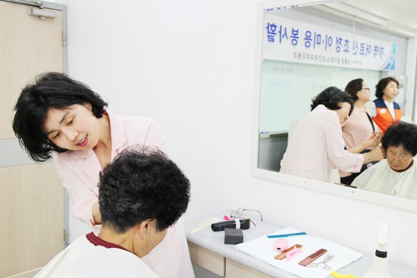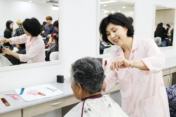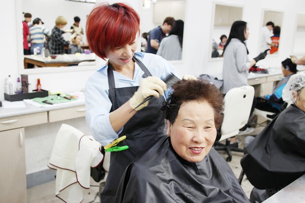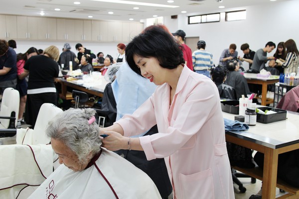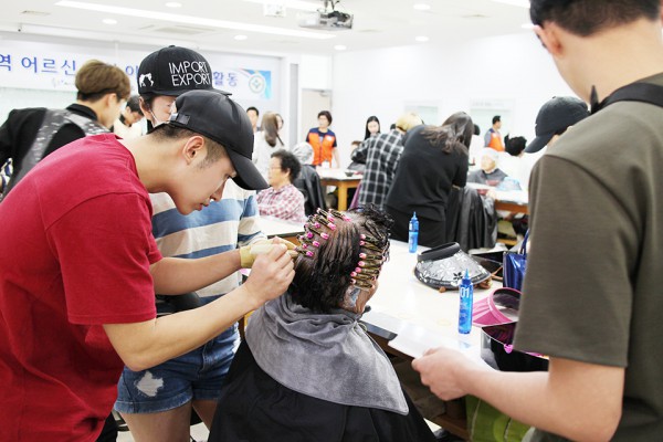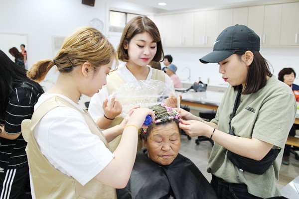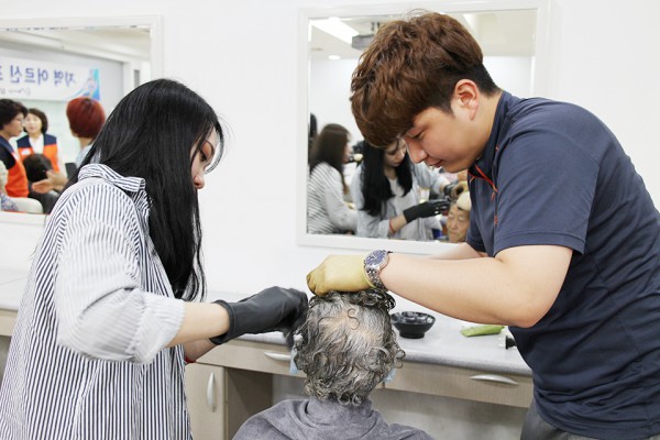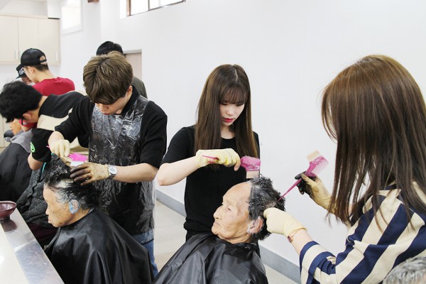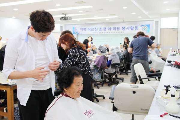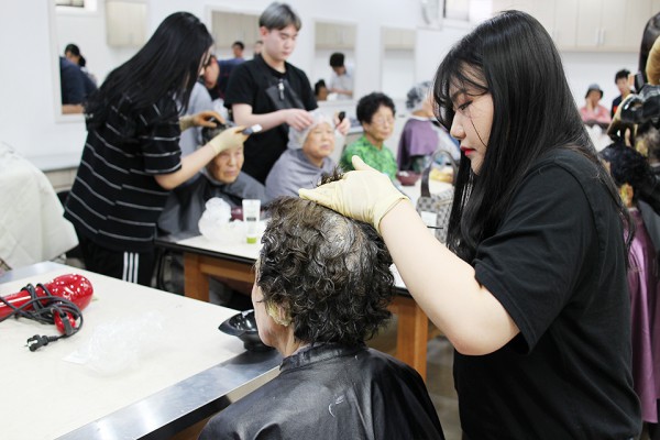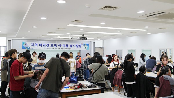 2017년 5월 26일 금요일 비교과 프로그램의 하나로 상봉동좋은세상협의회에 함께 지역어르신 초청 나눔행사를 가졌습니다. 이 날 지도교수인 배선향 교수님과 함께 2학년 A반 학생들이 지역어르신 20여분을 모시고 헤어커트, 염색을 시술하였습니다.