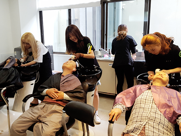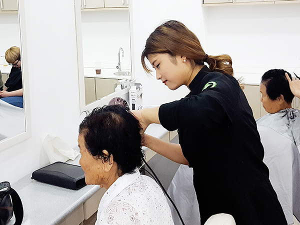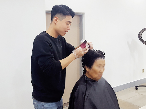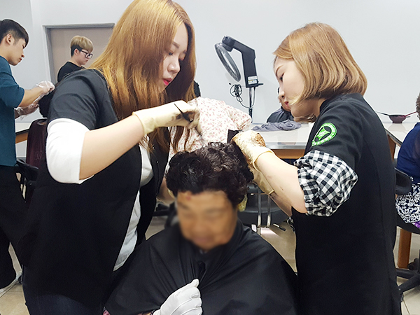 봉재환 교수님, 배선향 교수님, 2학년 A반 학생들이 염색과 커트봉사를 하였습니다.