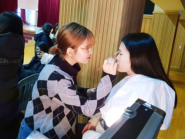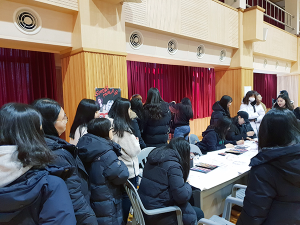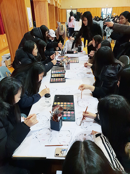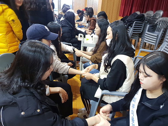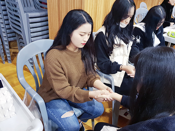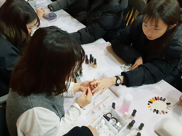 수능이 끝난 삼현여고 3학년 학생들이 우리대학에 방문했습니다. 대강당에 준비 된 손마사지, 네일아트, 메이크업, 두피진단, 헤어세팅, 헤어컬러차트 체험 부스에서 다양한 미용 체험을 하였습니다. 준비부터 마무리까지 고생하신 네 분 교수님과 재학생 여러분 수고하셨습니다. 삼현여고 학생들이 즐거운 시간이 되었으면 좋겠습니다.