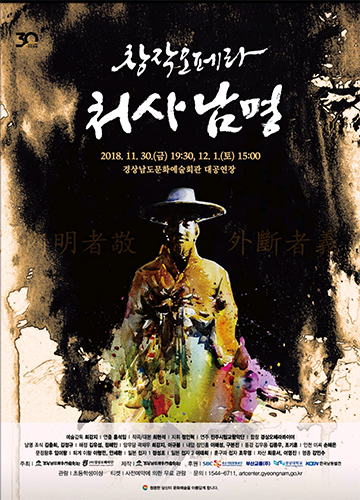 2018년 11월 30일부터 12월 1일까지 경남문화예술회관에서 열린 창작오페라 '처사남명'에서 우리학과 학생들이 무대분장에 참여하였습니다.