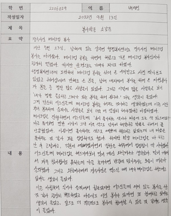 진주보건대 뷰티디자인과 남해 상주면행정복지센터 장수사진촬영 메이크업 봉사자 1학년 학생이 쓴 소감문