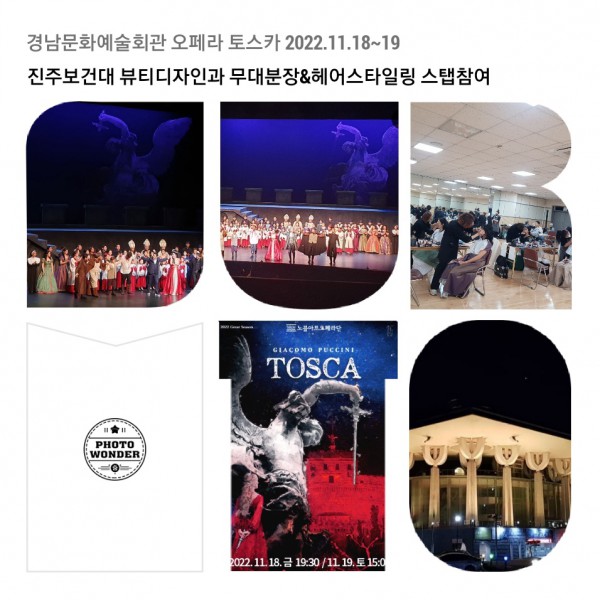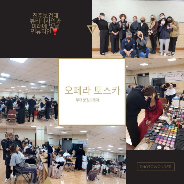 진주보건대 뷰티디자인과 학생들은 2022.11.18.~19까지 한국문화예술회관연합회가 주최하고 경남문화예술회관과 노블아트오페라단이 주관하며 문화체육관광부와 한국문화예술위원회가 후원하는 오페라 '토스카'의 무대분장 및 헤어스타일링에 스텝으로 참여했습니다. 김은희 교수님의 지도하에 공연에 참여하여 이를 통해 '무대공연메이크업' 교과목을 수강하는 뷰티디자인과 학생들에게는 직접 배우에게 분장과 헤어연출을 하며 다양한 현장경험을 쌓을 수 있는 귀중한 시간이었다고 생각합니다~